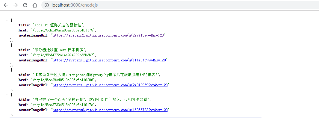 这里是在上面的基础上继续完成来实现这个简单的网页爬虫,通过访问localhost:3000时,以 json 的形式在页面显示输出 CNode(https://cnodejs.org/ ) 社区首页的所有帖子标题和链接。