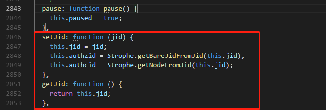 node_modules/strophe.js/dist/strophe.js,大约在 2845行pause: function pause() {this.paused = true;}后面,加入以下代码
